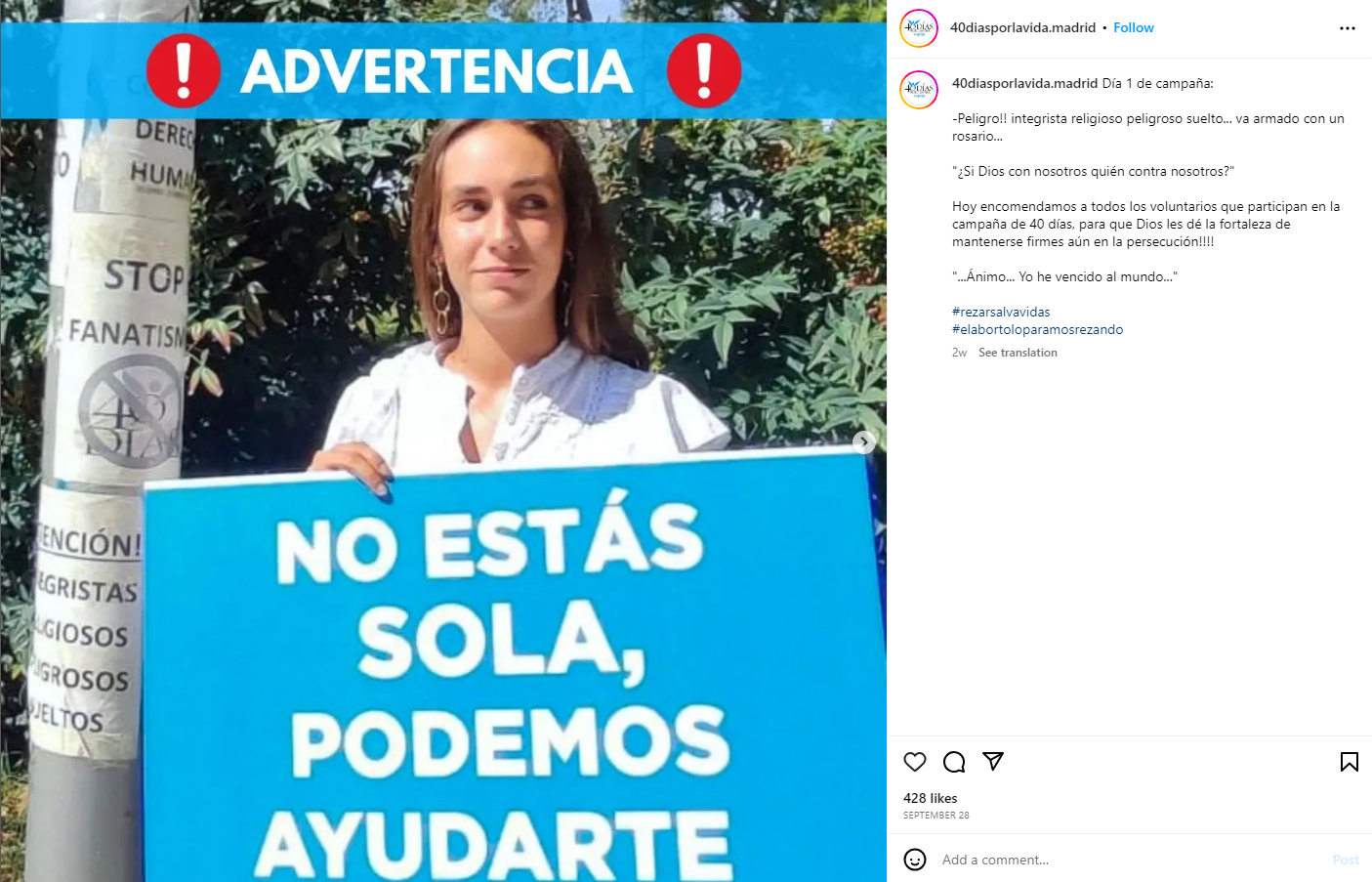 An Instagram post from 40 Days for Life Madrid has a banner at the top reading “Warning!” and shows a woman standing next to one such lamppost holding a sign reading “You are not alone, we can help you.” The text that follows says “Day 1 of the campaign: Danger!! Religious fundamentalist on the loose… armed with a rosary. ‘If God is with us, who can be against us?’ Today we entrust [to God] all the volunteers participating in the 40-day campaign so that God may give them the strength to stand firm even during persecution!“…Courage… I have overcome the world.”