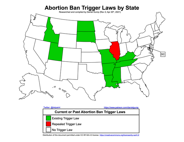 Trigger laws are defined as laws that are “currently unenforceable, but may achieve enforceability if a key change in circumstances occurs.” In this case, they’re laws banning abortion which aren’t currently enforceable but would be should Roe ever fall. Currently trigger laws are already in place in ten states and are as follows: