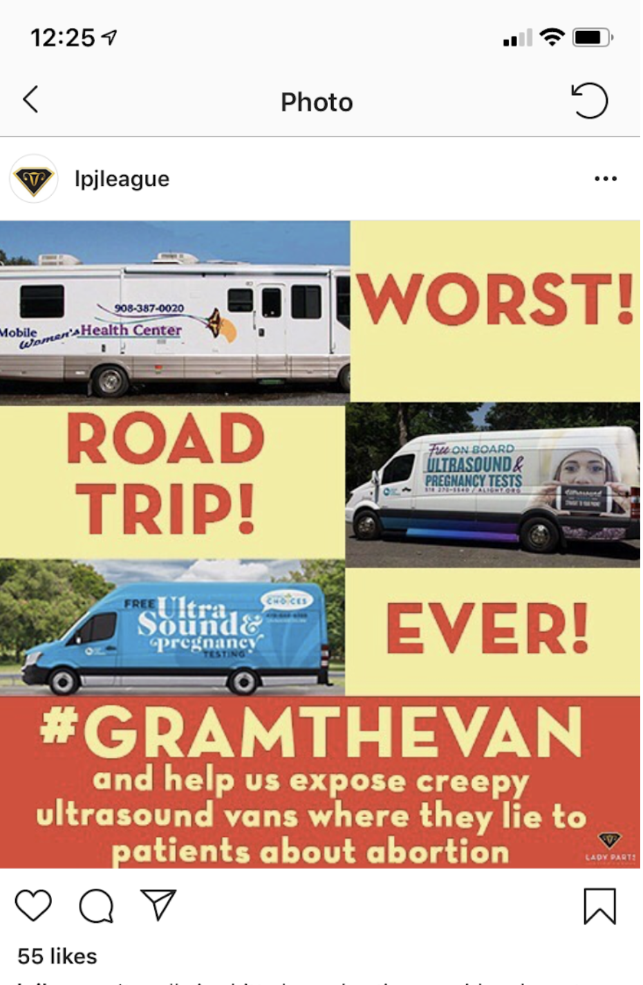 Group called "Lady Parts Justice League" claims mobile medical units offering free ultrasounds to women in need are "creepy." | Photo: LPJL Instagram