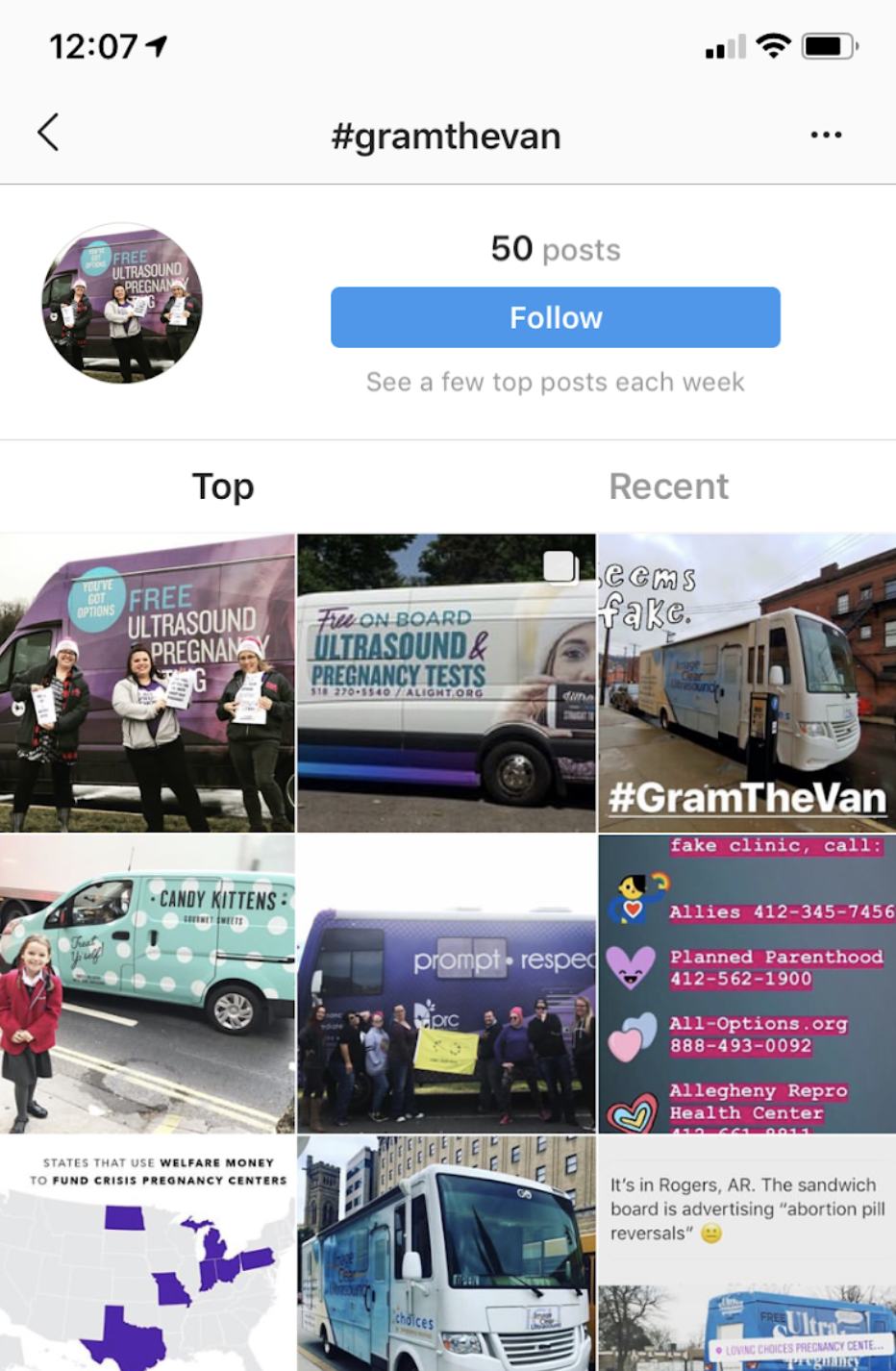 Launched as part of a national campaign organized by Lady Parts Justice League, the effort asks people to snap and post images of CPC [“crisis pregnancy center”] vans and post them to social media sites like Instagram. Abortion rights advocates believe the official-looking vehicles offer free services like ultrasounds and STD testing in order to lure women away from legitimate healthcare providers like Planned Parenthood.