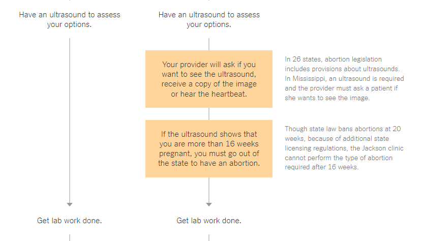 This New York Times article (from 2018, pre-Dobbs) contrasted California (left) and Mississippi (right) in terms of abortion restrictions. One “restriction” listed was “Your provider will ask if you want to see the ultrasound, receive a copy of the image, or hear the heartbeat.” The graphic also includes a note explaining “the provider must ask a patient if she wants to see the image.”