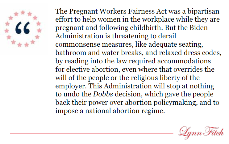 “The Pregnant Workers Fairness Act was a bipartisan effort to help women in the workplace while they are pregnant and following childbirth,” said Attorney General Lynn Fitch. “But the Biden Administration is threatening to derail commonsense measures, like adequate seating, bathroom and water breaks, and relaxed dress codes, by reading into the law required accommodations for elective abortion, even where that overrides the will of the people or the religious liberty of the employer. This Administration will stop at nothing to undo the Dobbs decision, which gave the people back their power over abortion policymaking, and to impose a national abortion regime.”