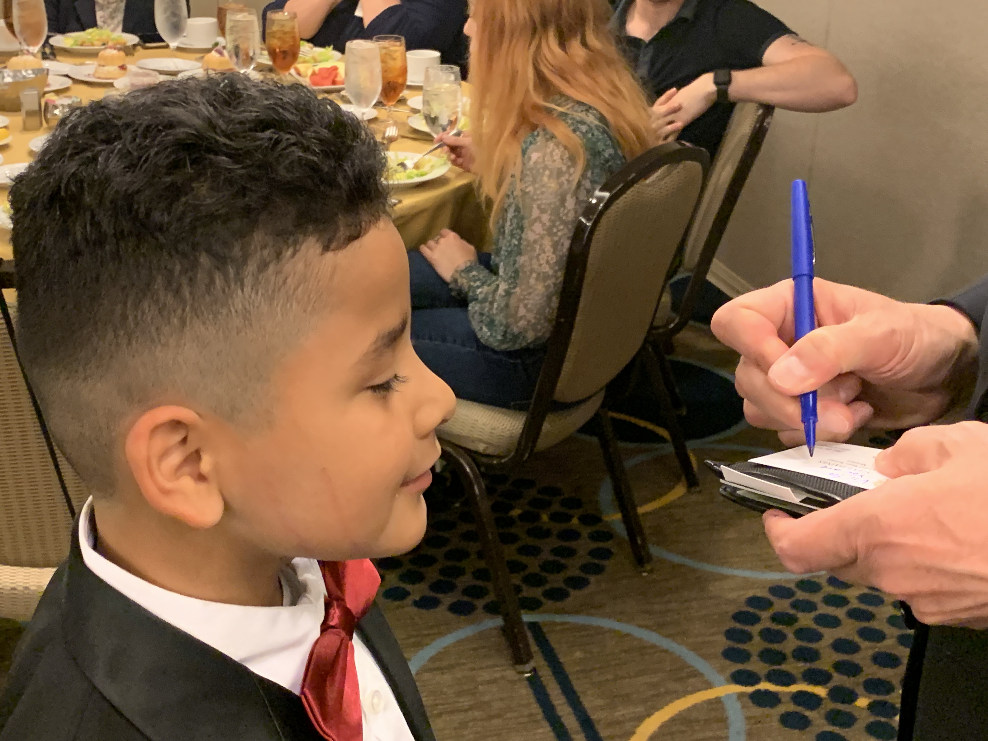 Victor watches as Sen. Daines writes him a message on his business card/Lisa Bourne
