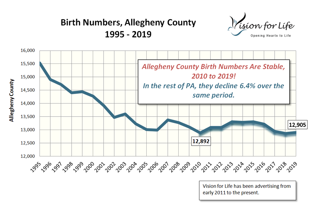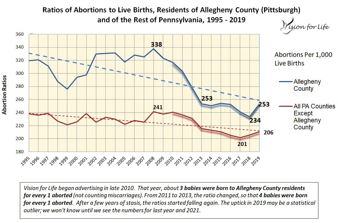 Vision for Life advertises in Allegheny County on Facebook to residents of the County. (Some of the abortions performed in Allegheny County would be on non-residents – people coming from surrounding counties and nearby states. They would not see our Facebook ads.) We also want to measure the effect of our advertising on all pregnant women considering abortion, so we don’t look at raw numbers so much: pregnancy rates have been going down, and we want to see what proportion of all pregnant women chose life. So we look instead at the ratios of abortions to births for residents of Allegheny County. Abortions to this group were up 8.6%, from 3,007 to 3,265.