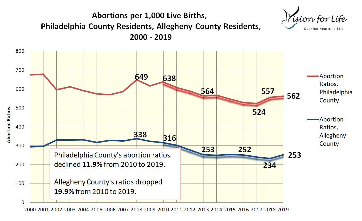 It is shocking to realize that in Philadelphia County, more than 1 out of 3 pregnancies ended in abortion in 2019 (562 abortions per 1,000 births). In Allegheny County, 1 out of 5 pregnancies ended in abortion. Before we began advertising, that ratio was about 1 out of 4.