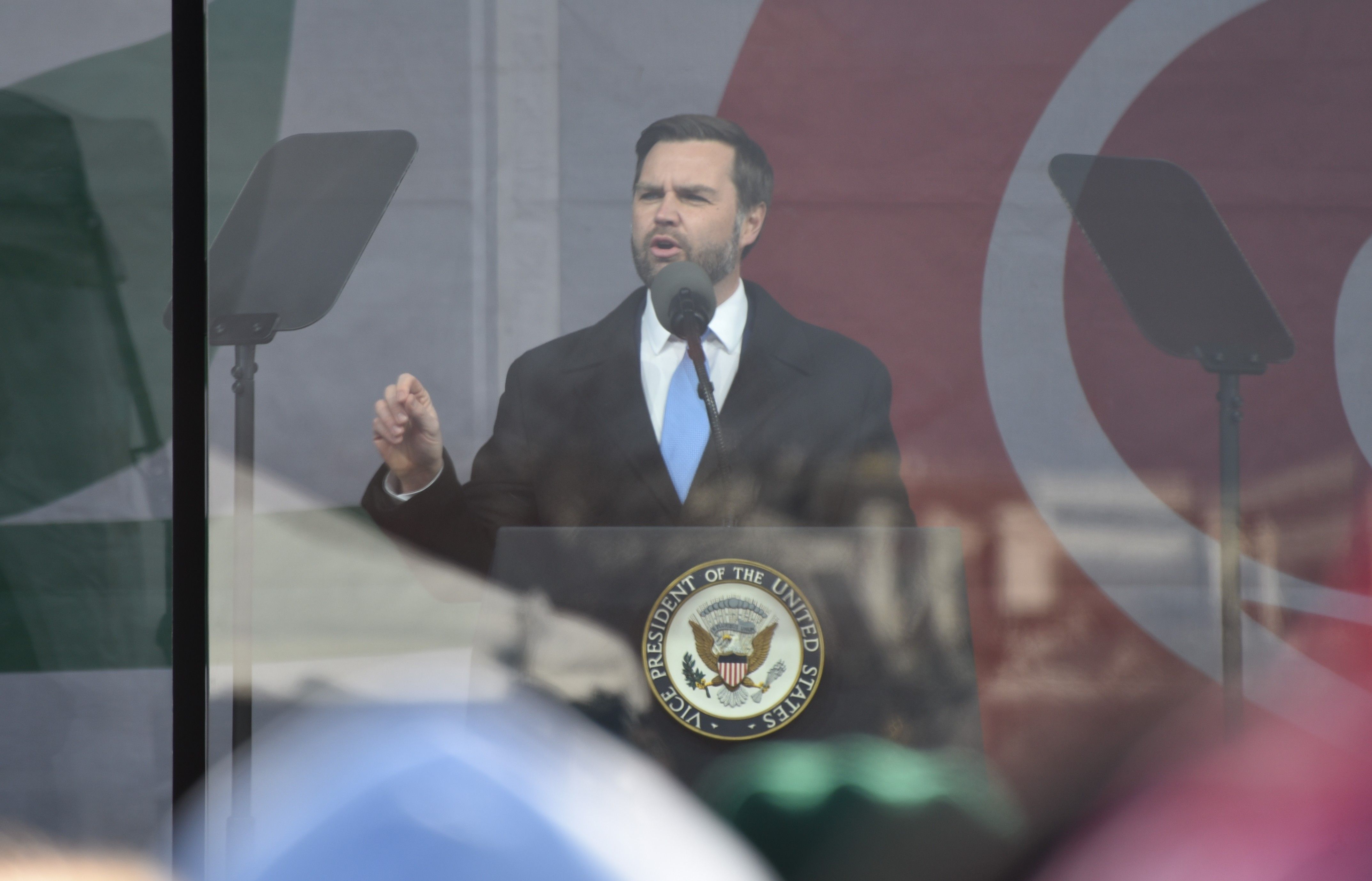 Vice President J.D. Vance addresses the 2025 March for Life rally from behind a bullet proof partition/Lisa Bourne