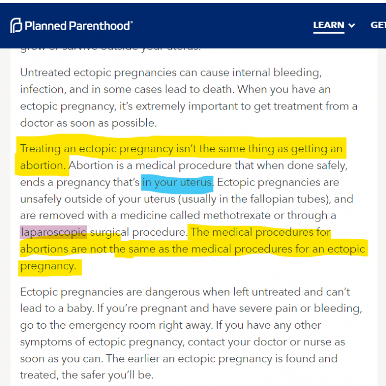 Although many people use the term “abortion” to refer to any instance of removing a preborn child from the woman prematurely, medically, induced abortion and treatments for a mother with a serious health condition are considered to be different. First of all, the intentions of the doctors are very different than in elective, induced abortions…etc.it is not considered an abortion in the same way an elective abortion is considered. Not only are the procedures performed differently, the intentions of the doctors are very different than elective abortions. In an elective abortion, the abortionist’s main goal is the death of the pre-born child. In cases like ectopic pregnancy, the death of the pre-born child is an unavoidable and unintentional side effect of saving the life of the mother. Even Planned Parenthood’s own website says that treatment for ectopic pregnancies is not the same as abortions.