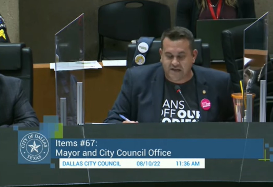 The following day (August 10), a small number of pro-life activists present at the meeting discovered that the deck was stacked against them when Councilman Adam R. Bazaldua came into chambers wearing a “Bans Off Our Bodies” shirt decked out with Planned Parenthood buttons. The resolution was immediately voted back onto the agenda where speaker time was reduced from the original three-minute time slots down to one minute.