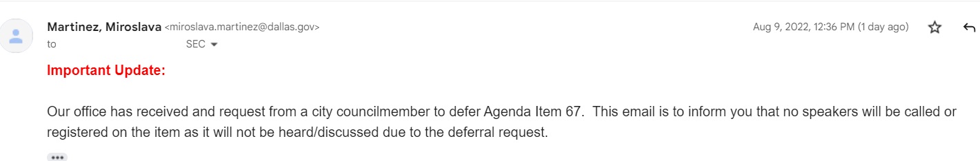“Our office has received and request from a city councilmember to defer Agenda Item 67. This email is to inform you that no speakers will be called or registered on the item as it will not be heard/discussed due to the deferral request,” the e-mail stated.