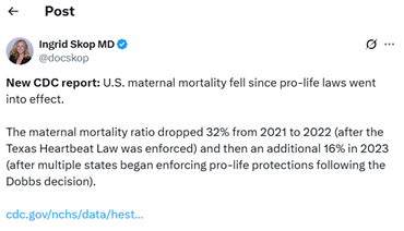Following the CDC’s release of the report in February 2025, Ingrid Skop, M.D., FACOG, vice president and director of Medical Affairs for the Charlotte Lozier Institute, posted on X, noting the post-Dobbs decrease, “U.S. maternal mortality fell since pro-life laws went into effect.”