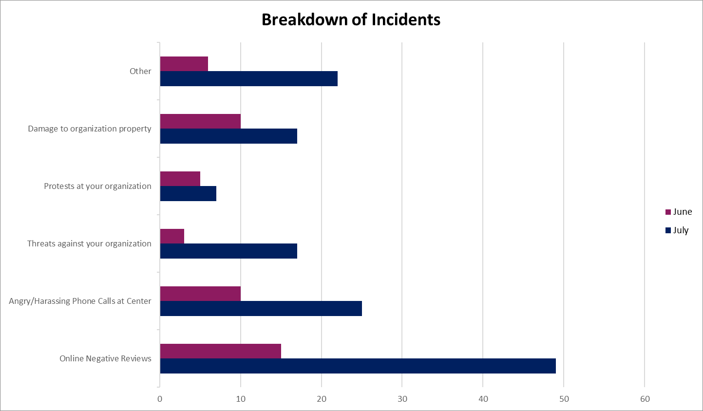 In that survey 137 responses were received. Of the centers responding 30.6% had seen fake online reviews, 20.4% had gotten angry/harassing phone calls, 6.1% had received threats, 10.2% had experienced protests at their center, 20.4% had seen property damage, and 12.2% had been the target of some other type of attack.