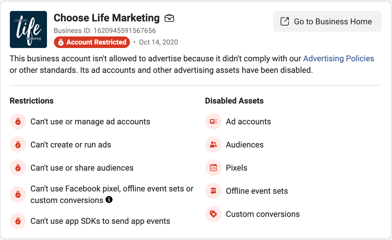 On October 15, we logged into our Facebook Business Manager account like any other day to check on the ads we run for these pregnancy centers. At the top of the screen was a notice that our account had been restricted because we apparently “violated Facebook’s advertising policies.”
