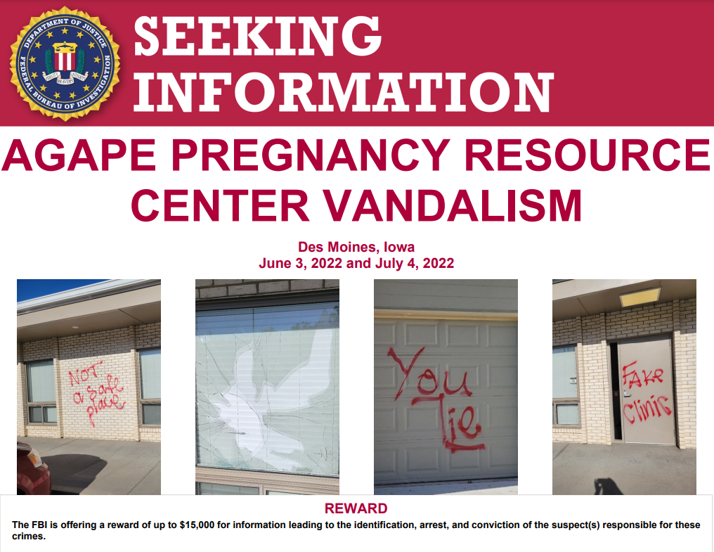(CNA) The FBI’s Omaha, Nebraska, field office is offering a major reward to anyone who can help identify the individual or group who vandalized a pro-life pregnancy center in Des Moines, Iowa, in June 2022.