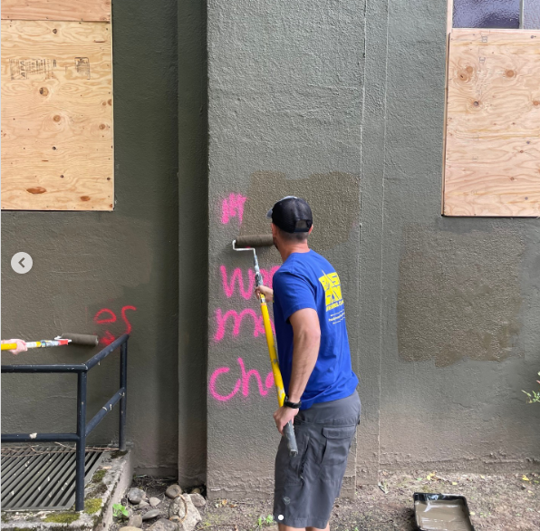 Volunteers from the Hinson Memorial Baptist Church in Portland, Ore., helped to clean up the exterior of the Hinson church annex building where the First Image Pregnancy Resource Centers administrative offices are located was damaged by rioters in late June.