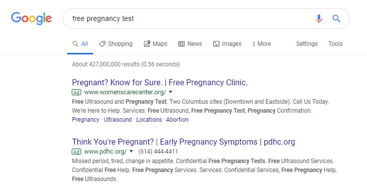 A search for "free pregnancy test" resulted in ads from the same pregnancy centers from above without the in-ad tag.