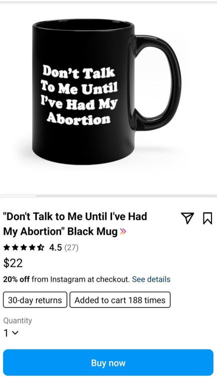 The ad for this “Don’t Talk to Me Until I’ve Had My Abortion" mug was running on Instagram promoting the mug and abortion to its users in hopes to make a quick buck. A former classmate posted this on her Instagram story. She was outraged, offended, and angry that abortion was so downplayed in such a childish manner.