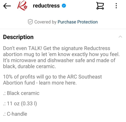 Of course as is stated in the item description, 10% of every mug purchased will be donated to support Arc Southeast, a pro-abortion organization which proclaims to “provide funding and logistical support” for “reproductive care including abortion services.”