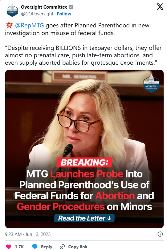 The investigation comes with the Trump administration seeking to cut off Medicaid funds to Planned Parenthood in the budget reconciliation package, known as the “big, beautiful bill,” which has already passed the House.