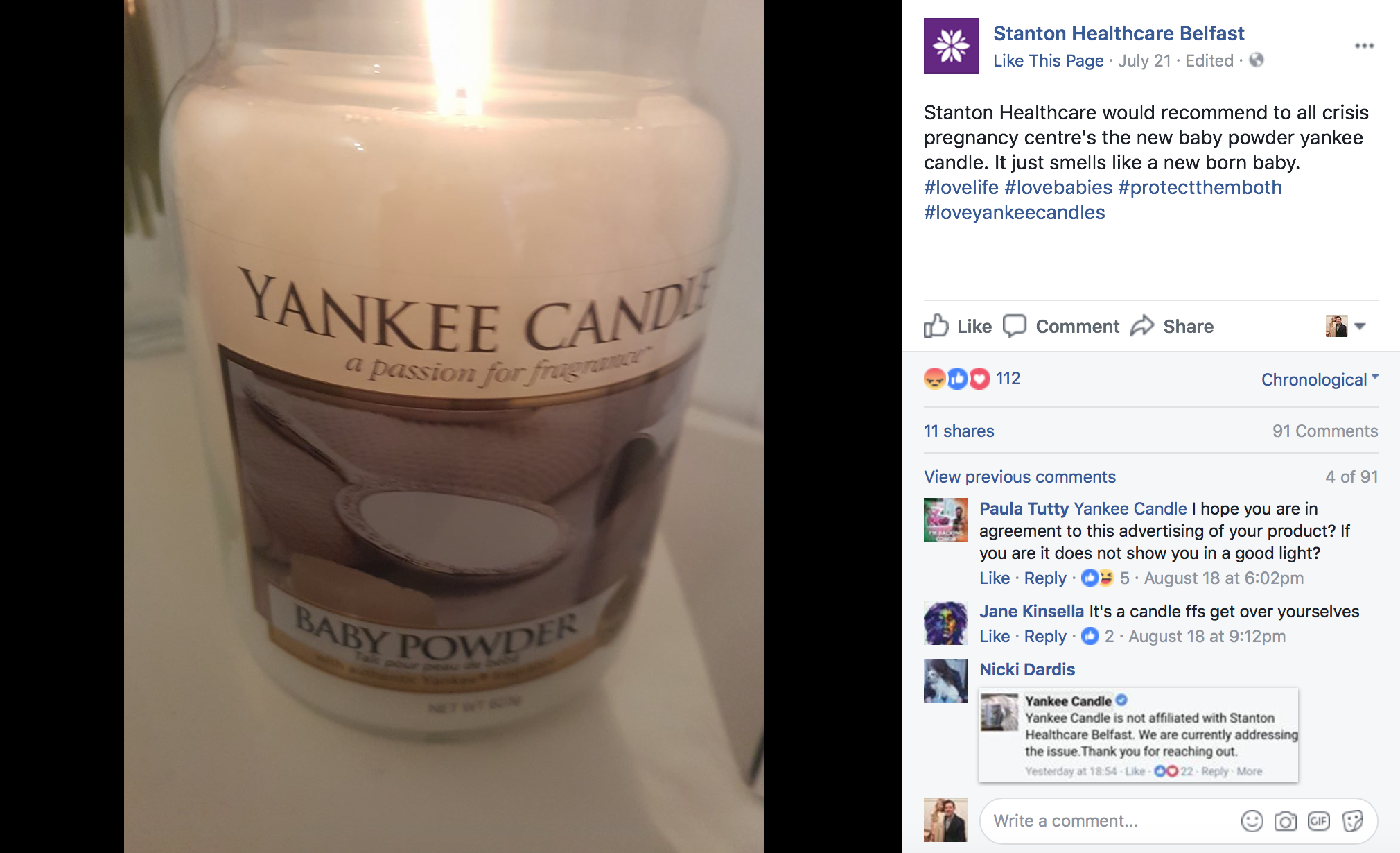 Quite unassumingly, the post read, "Stanton Healthcare would recommend to all crisis pregnancy centre's the new baby powder yankee candle. It just smells like a new born baby. #lovelife #lovebabies #protectthemboth #loveyankeecandles".