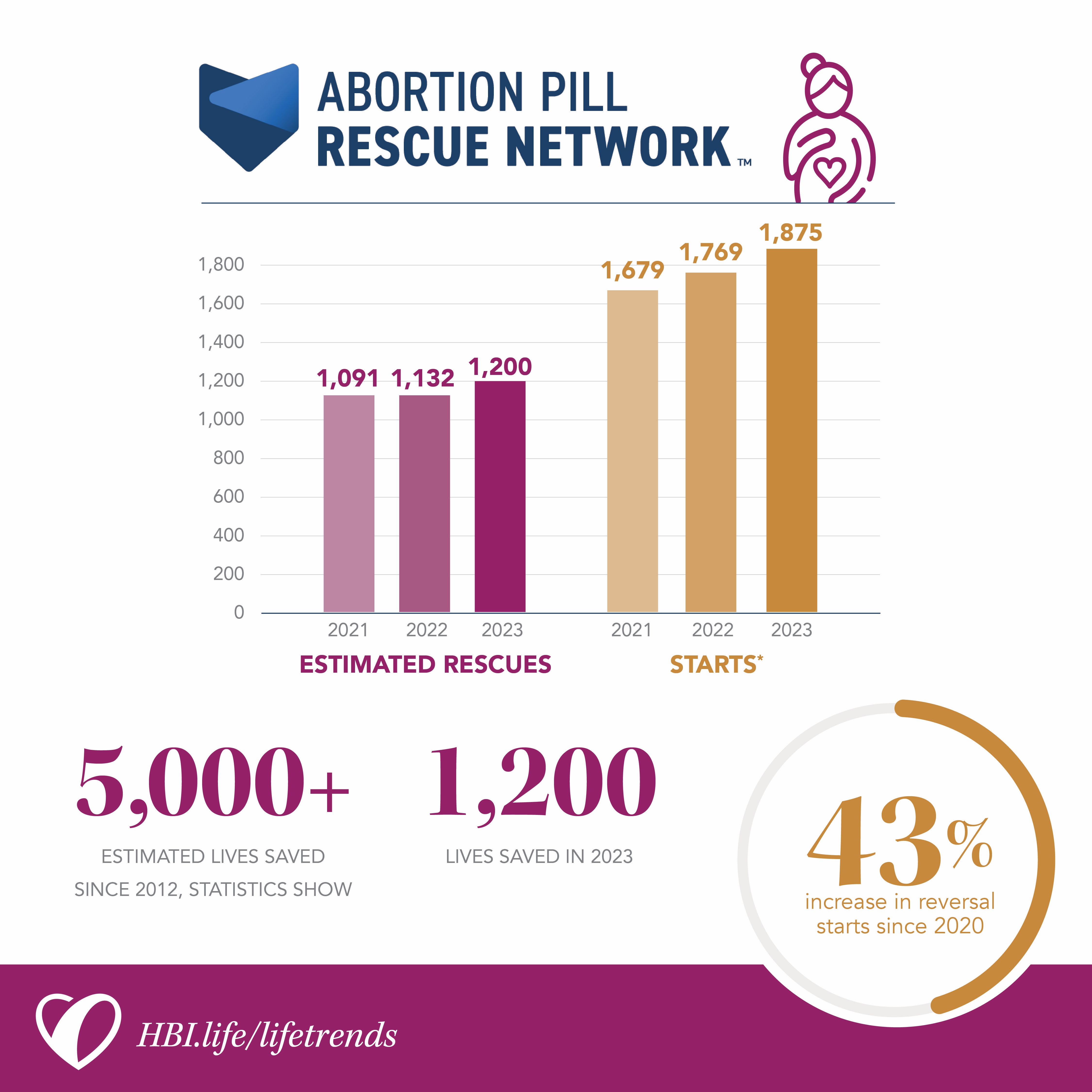 The Heartbeat-managed Abortion Pill Rescue® Network (APRN) offers a life-affirming option in contrast to chemical abortion. The APRN connects women who regret taking the first dose of the abortion pill regimen to a network of medical professionals trained to administer the reversal protocol. Life Trends numbers pertaining to APR: