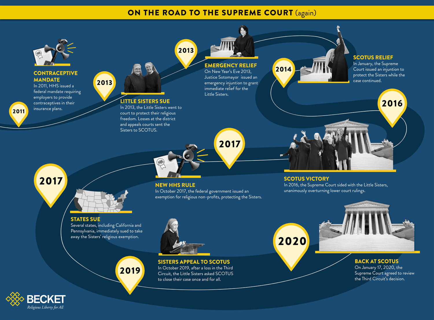Back in 2011 the Obama administration began requiring employers to provide cost-free coverage for contraceptives, sterilization and “emergency birth control” in employee health plans under the ACA. While the Obama administration gave an “accommodation” to the Little Sisters of the Poor and other religious non-profits that had objected to the mandate, the Sisters sued in 2013, arguing the process still meant they would essentially be complicit in the provision of contraceptive coverage being delivered through their health plans.