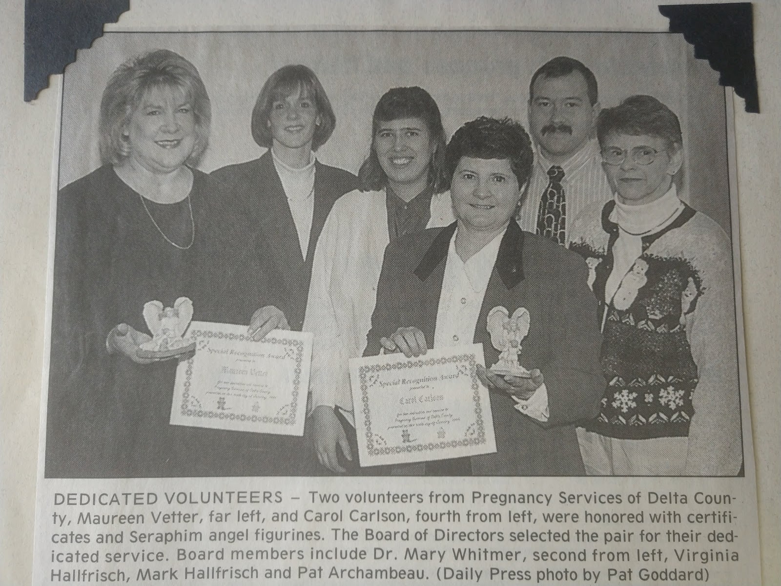 Newspaper clipping from the 1990s features Carlson, as well as Dr. Mary Whitmer and Virginia Hallfrisch, both of whom have served on the center's board of directors. | Photo Courtesy: Pregnancy Services of Delta County