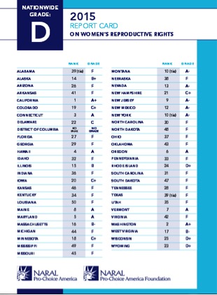 NARAL Pro-Choice America ranks Missouri No. 45 out of 50 states and graded them with an “F” on the “2015 Report Card for Reproductive Rights.” (The nation as a whole earned a “D.”)