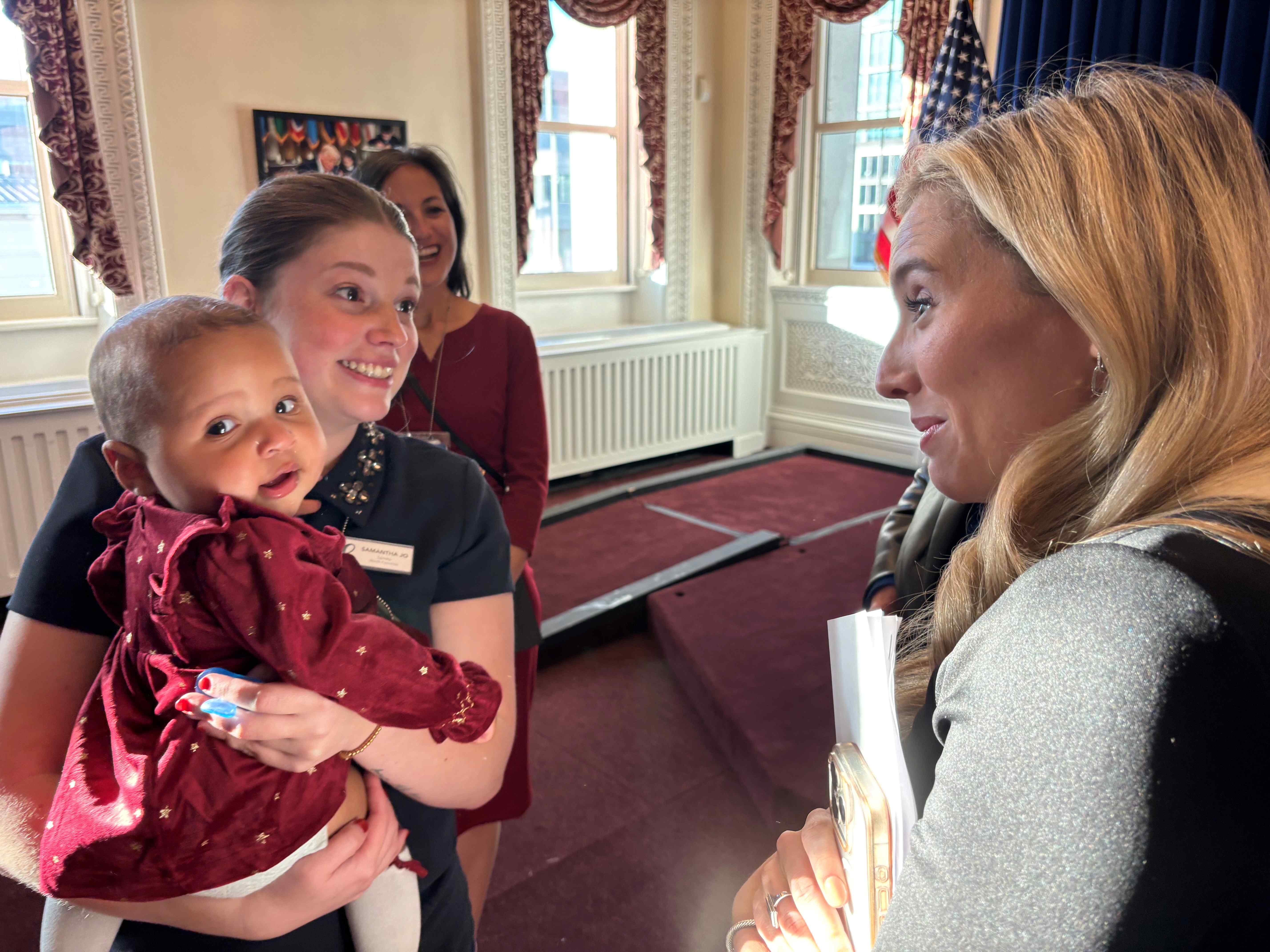 Special Assistant to the President and White House Director of Media Affairs Sonny Joy Nelson talks with Babies Go to Congress mom Samantha and her baby Zoe Grace while Heartbeat International VP of Communications and Marketing Andrea Trudden looks on. Samantha and Zoe are served by Nelson's mother Tonya Baker Nelson's Hand Of Hope Pregnancy Resource Centers, and Baker Nelson chose life for her daughter despite not having her partner's support in the unexpected pregnany/Lisa Bourne