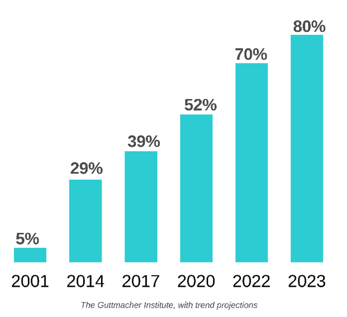 In the United States, it’s predicted that more than 80% of all abortions will be chemical very soon. Abortion data relies heavily on the reporting of abortion providers which is typically not mandated and there is nearly no data for telehealth abortions or those purchased on websites. Chemical abortion is even more common worldwide. In some European countries up to 90% of abortions are done using pills.