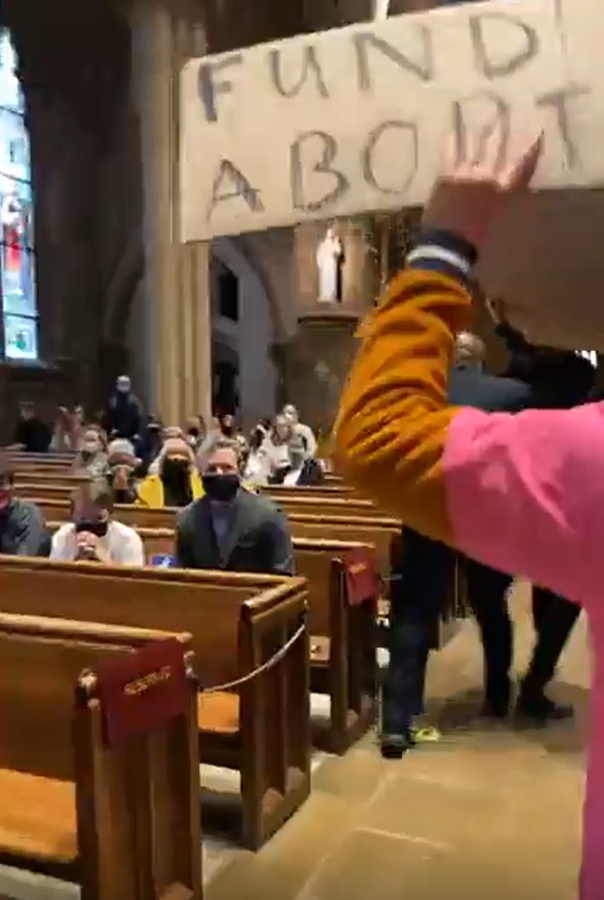 “Protesters were coming down the center aisle and two side aisles screaming and carrying signs,” she said. “They converged in front of the church between the pews and the altar area, still screaming and chanting.”