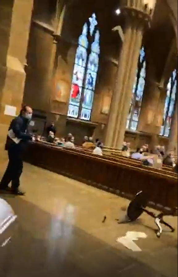 Now encircled, the intruders were walked to the back of the Cathedral and out the doors. Within five minutes, things began to calm inside the church.