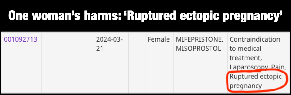 One Canadian woman (001092713), age unknown, experienced a near-death ordeal in a situation that critics of abortion pills previously predicted. Critics warned that allowing the abortion pill to be given to women without any medical supervision would inevitably result in a woman with an undiagnosed ectopic pregnancy using the pills – to her harm.
