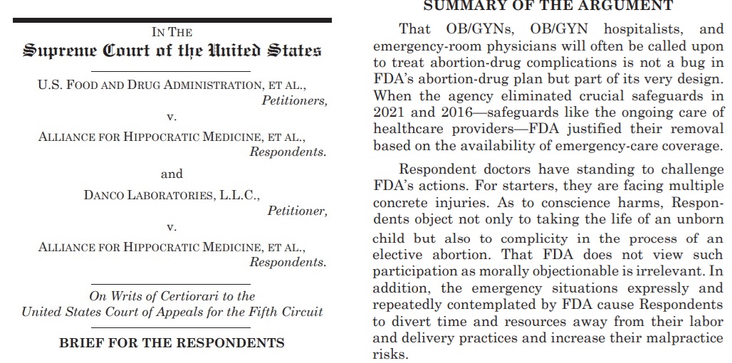 “FDA says Respondent doctors’ harms are ‘speculat[ive]’ because Respondents do not prescribe abortion drugs… But prescribing the drugs isn’t what increases Respondents’ exposure. That harm results from FDA’s removal of the safeguards. FDA’s unlawful actions have left Respondent doctors ‘to deal with preventable emergent and life-threatening situations’” AHM wrote. “FDA’s actions have forced Respondent doctors to witness and participate in the grisly process of treating abortion-drug complications—retained fetal parts, heavy bleeding, severe infections—causing the doctors mental, emotional, and spiritual distress.”