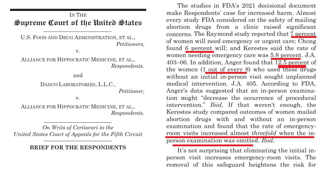 “FDA has long recognized that emergency care is essential to handle abortion-drug complications; the agency’s own numbers say that roughly one in 25 women who take mifepristone will end up in the emergency room; and Respondent doctors have testified to routinely treating women suffering abortion drug harm,” the AHM brief claimed. “Factor in that hundreds of thousands of women take abortion drugs each year in the United States, and that FDA’s own data indicates that tens of thousands of them go to the emergency room, and Respondents easily establish a ‘substantial risk’ that these harms ‘will occur’ again.”