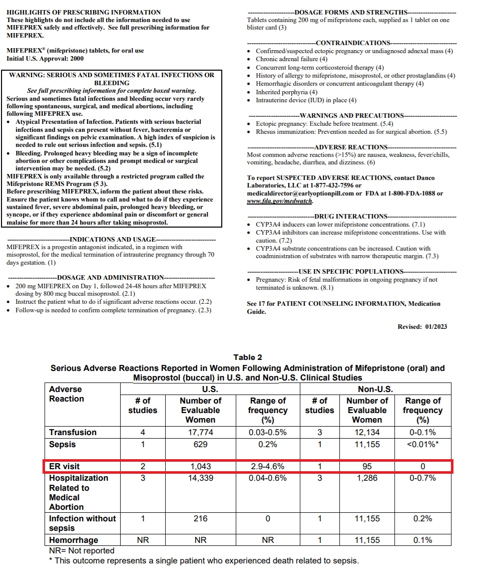 The Alliance Defending Freedom (ADF) who is representing AHM, directed Live Action News to mifepristone’s latest 2023 label, where in a table 2 entitled, “Serious Adverse Reactions Reported in Women Following Administration of Mifepristone (oral) and Misoprostol (buccal) in U.S. and Non-U.S. Clinical Studies,” the 2.9% – 4.6% ER statistic is located.
