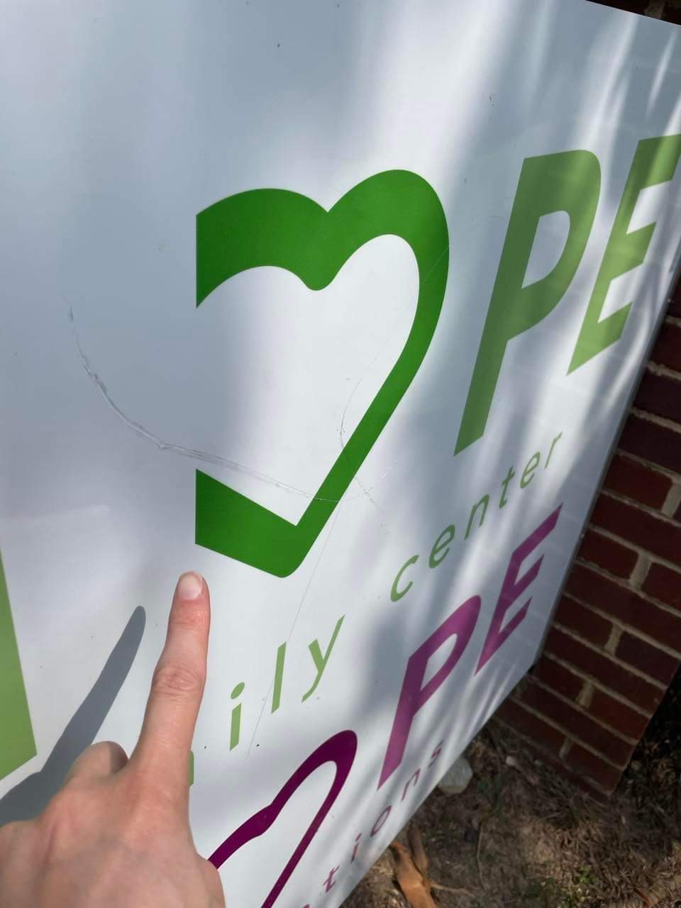 It looks to me like she tried to scratch the word “Hope” off our sign, so I must believe she may feel no hope herself to resort to destroying property at a local nonprofit that offers hope and love.