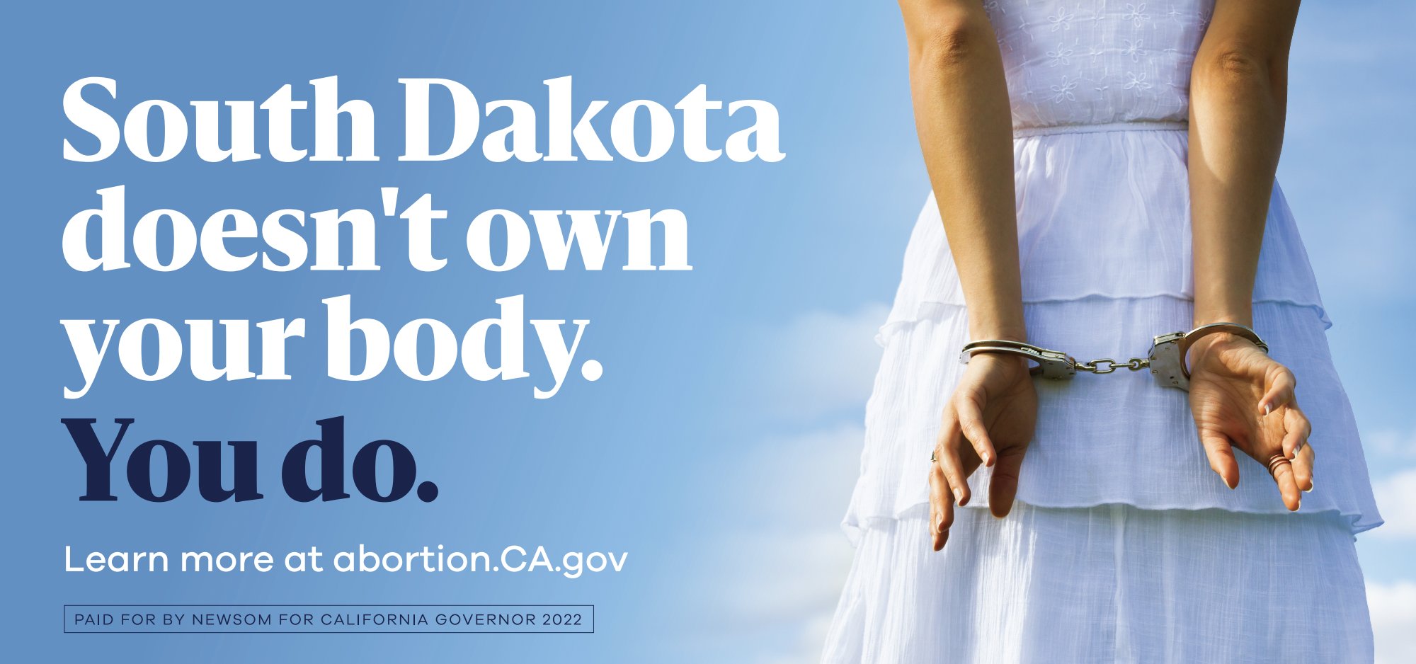 The South Dakota Newsom abortion billboard reads: “South Dakota doesn’t own your body. You do,” and features an image of a woman in handcuffs.