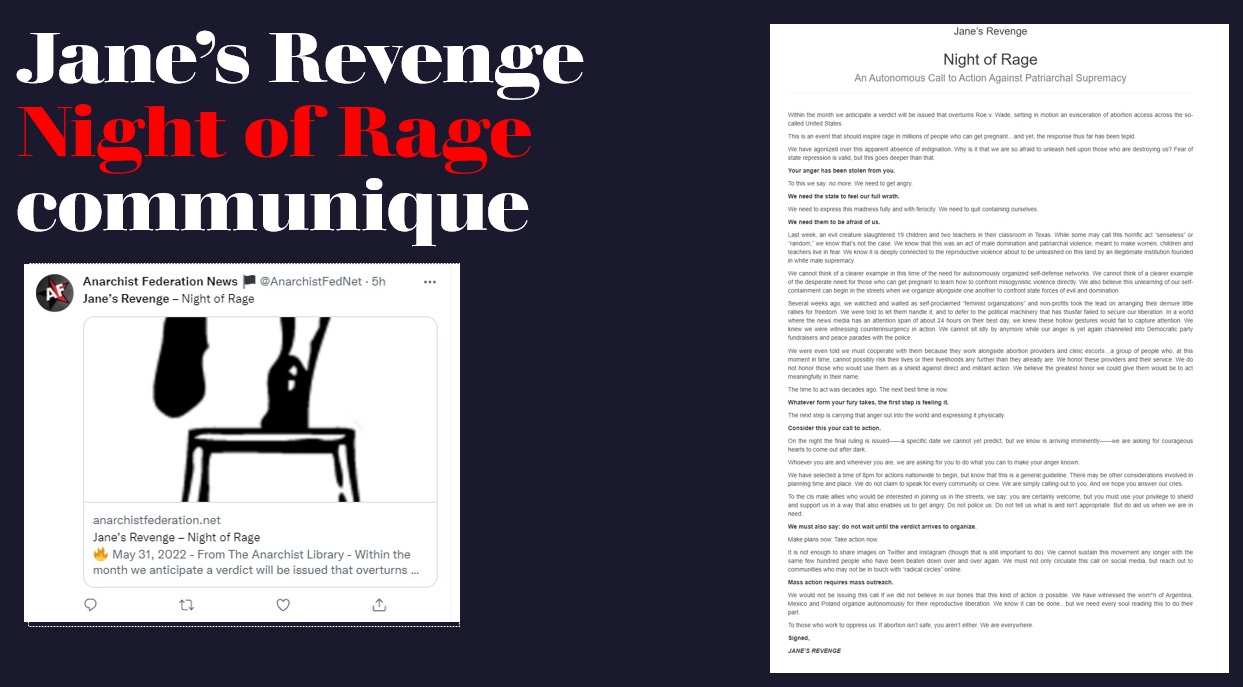 (Live Action) A pro-abortion terrorist group has issued a communique instructing its followers to carry “anger out into the world” by “expressing it physically” on the night the Supreme Court releases the opinion in the Dobbs v. Jackson Women’s Health Organization case, which, due to a leaked draft opinion, is expected to overturn Roe v. Wade this month. The “Night of Rage” message, allegedly from Jane’s Revenge, was downloaded by an anarchist website on May 31.