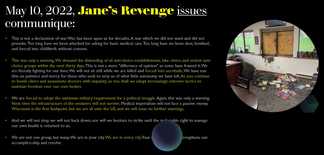 Jane’s Revenge’s first communique, published by Robert Evans on May 10, vowed to “adopt increasingly extreme tactics to maintain freedom over our own bodies” while demanding the “disbanding of all anti-choice establishments, fake clinics, and violent anti-choice groups within the next thirty days.” That alleged deadline will expire on June 10. The group, which already claimed responsibility for a May 8 act of terrorism against the Wisconsin Family Action office in which an arsonist threw Molotov cocktails into the facility, claims that if its demands are not met, it will be “forced to adopt the minimum military requirement for a political struggle.”