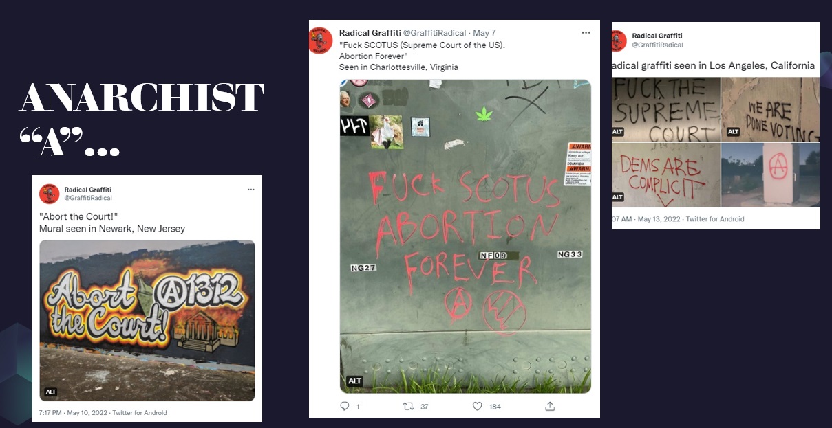 The twitter handle @GraffitiRadical published graffiti images – one on May 7 published a tweet that read “F*** SCOTUS forever” with the anarchist A symbol. Images of graffiti in Los Angeles, Calif., which read “F the Supreme Court”, “We are done voting”, “Dems are Complicit” with the anarchist A were posted May 13.