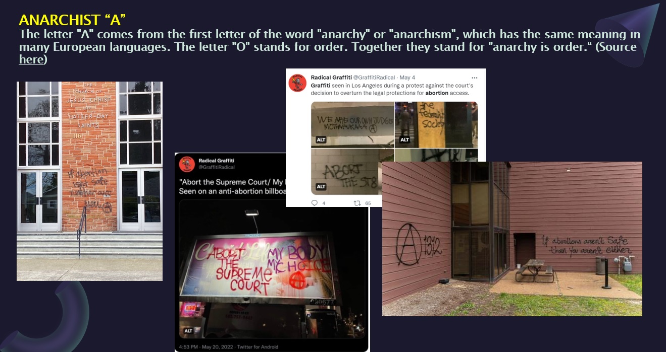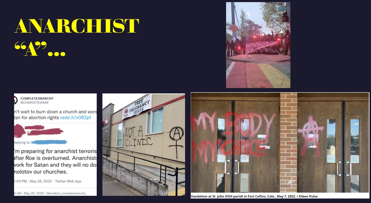 In addition to postings associated with Jane’s Revenge published on anarchist websites, a common theme dominant in many acts of vandalism is the anarchist symbol tagged on multiple Christian and pro-life facilities.