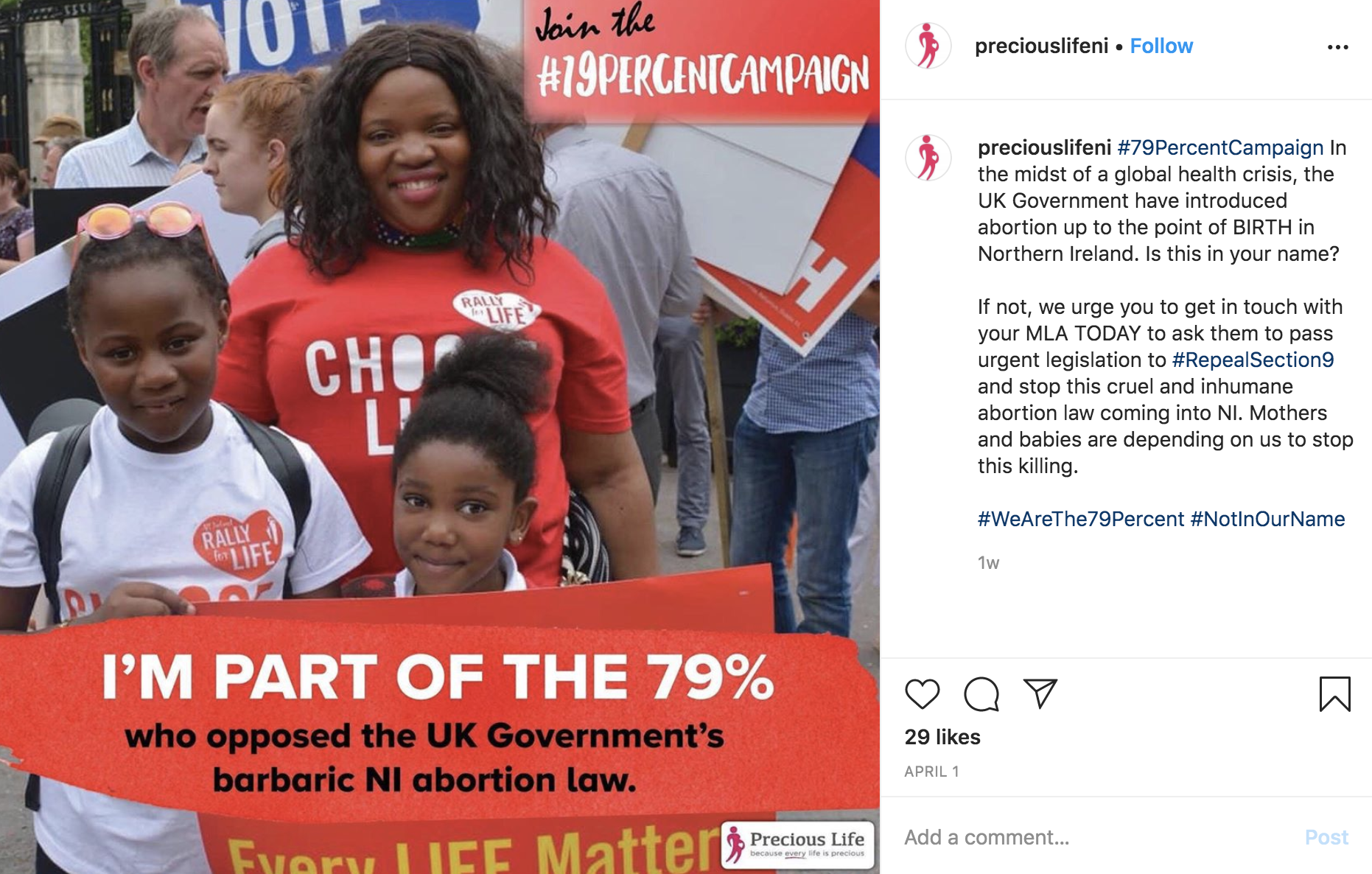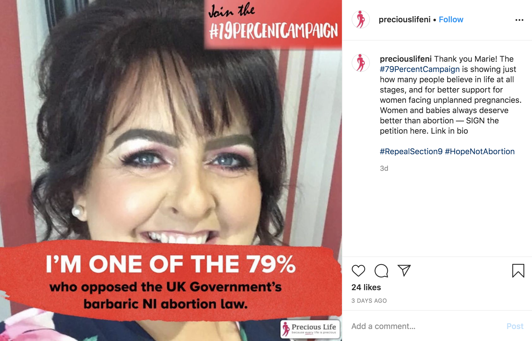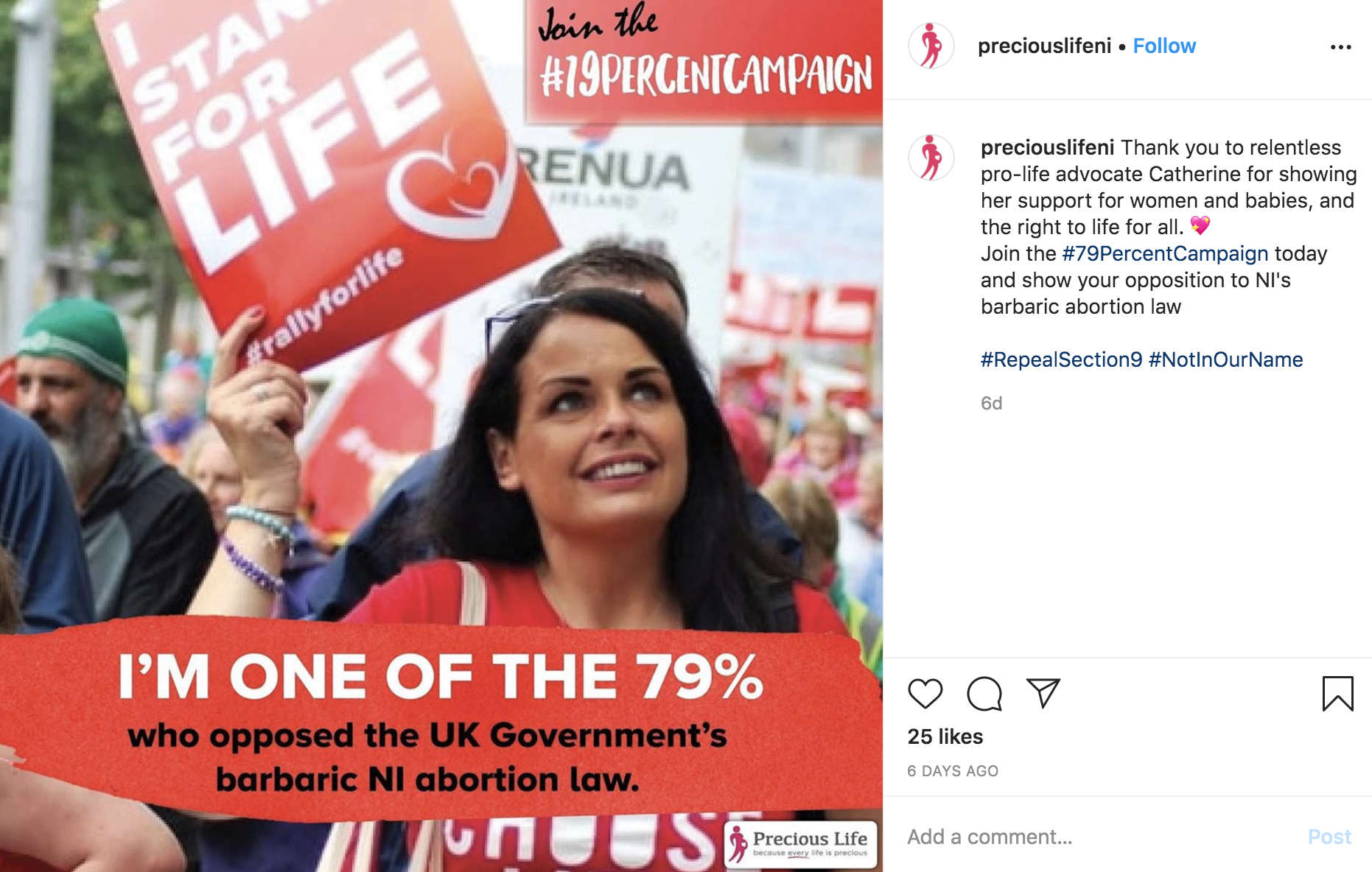 Precious Life, the nation's largest pro-life group, has established campaigns to raise awareness via social media that 79 percent of the country's citizens opposed change to Northern Ireland's pro-life laws and to also urge people to take action through a petition to rescind the country’s recently passed abortion law, Section 9 of the Executive Formation Act.