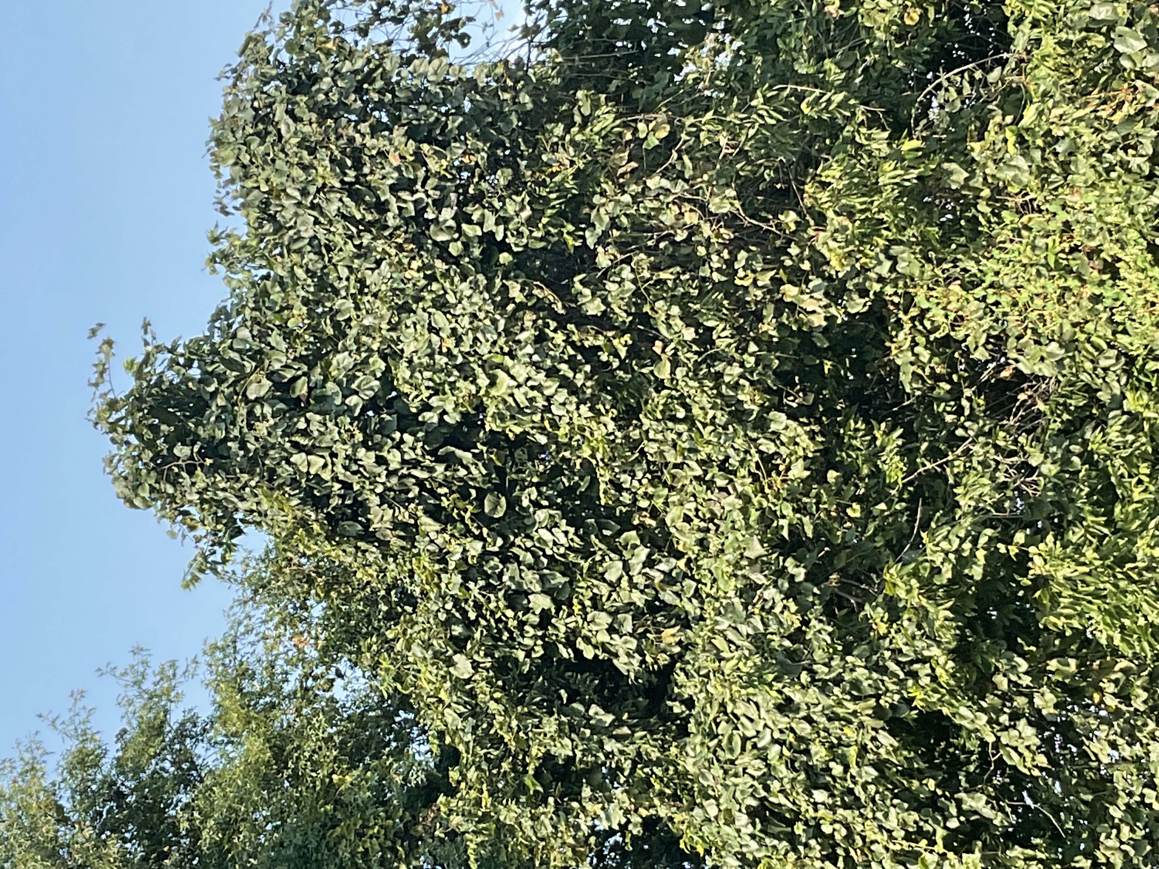 A closer look reveals the fruit of this vine, which is so worthless, not even the birds are bothering to eat it. Additionally, the vine is suffocating the tree underneath.