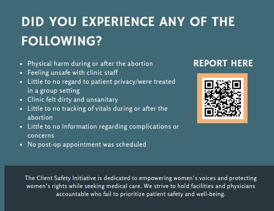 The Client Safety Initiative provides free assistance to women who have had negative experiences at abortion facilities by helping them submit complaints to state and federal oversight agencies.