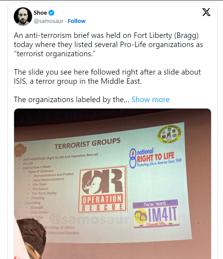 Photos of a slide shown to soldiers at Fort Liberty in North Carolina were recently leaked; the slides portrayed National Right to Life and Operation Rescue as potential terrorist groups. Bullet points on the slide said being “anti-abortion” and “Pro Life,” as well as opposing “Row v Wade [sic]” were potential indications of terrorist ideations. The slide contained various examples of pro-life advocacy, like demonstrations, protests, life chains, “the truth display” (displaying photos of abortion victims), and more. Counseling at pregnancy centers and on sidewalks was also mentioned, and the slide even included pro-life license plates.