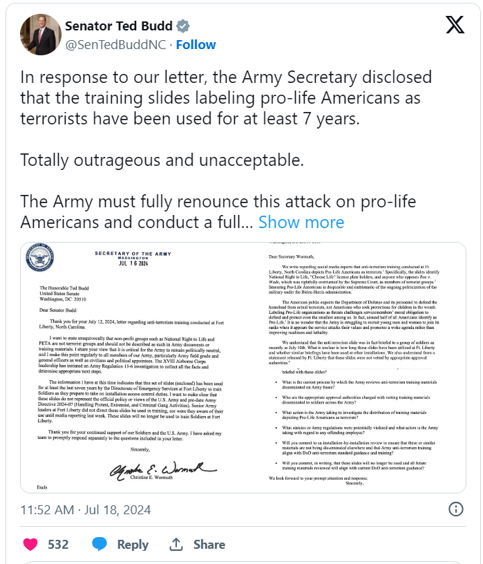 “In response to our letter, the Army Secretary disclosed that the training slides labeling pro-life Americans as terrorists have been used for at least 7 years,” Budd said. “Totally outrageous and unacceptable. The Army must fully renounce this attack on pro-life Americans and conduct a full investigation to ensure similar materials aren’t being used at other installations.”