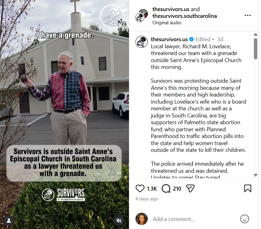 Survivors was protesting outside Saint Anne’s this morning because many of their members and high leadership, including Lovelace’s wife who is a board member at the church as well as a judge in South Carolina, are big supporters of Palmetto state abortion fund; who partner with Planned Parenthood to traffic abortion pills into the state and help women travel outside of the state to kill their children.