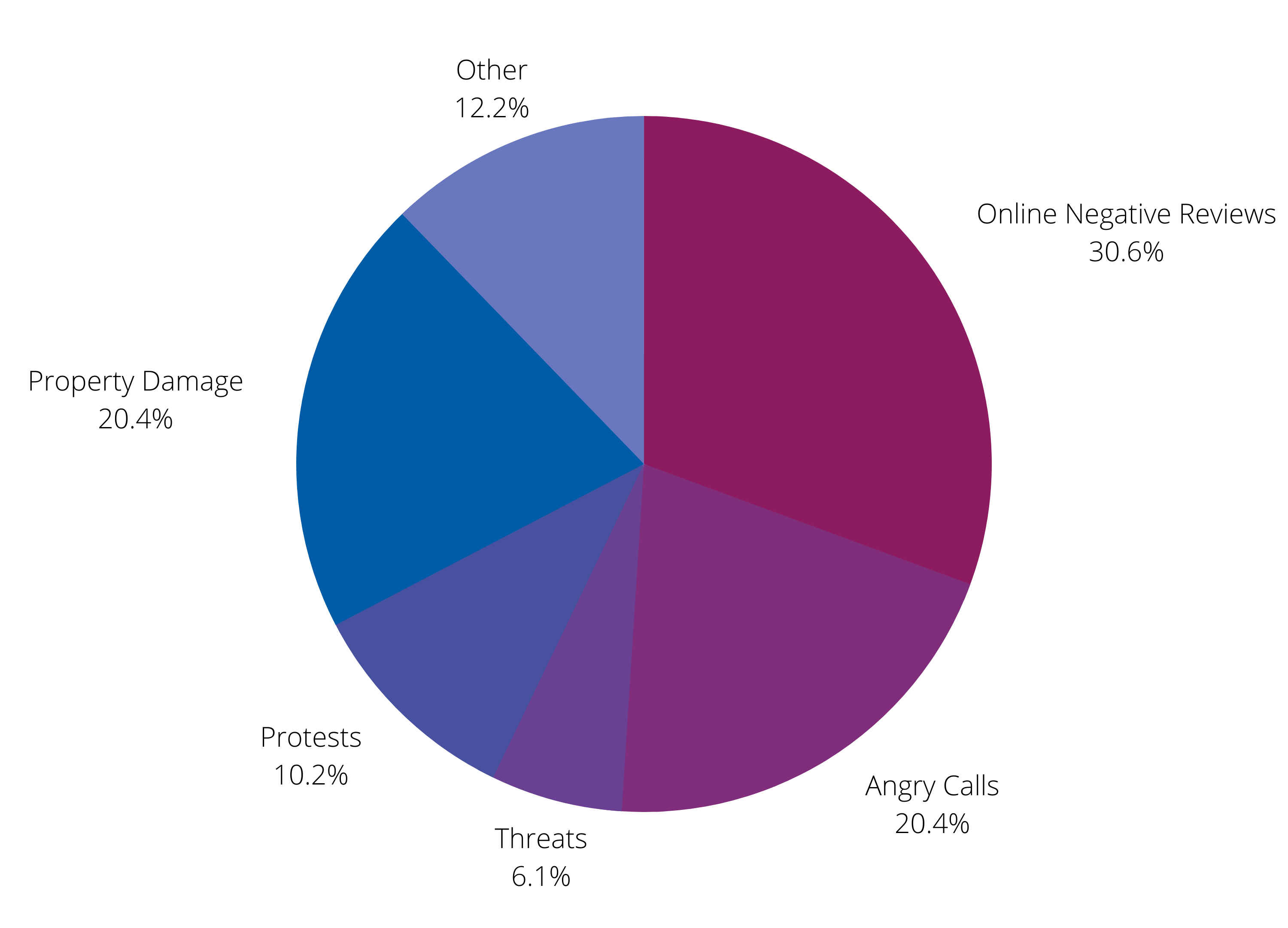 Of the organizations reporting incidents, a disturbing 20% reported property damage, more than 30% have seen an increase in fake online reviews, 20% have received angry calls, 10% have had protests outside their locations, and 6% have gotten threats.
