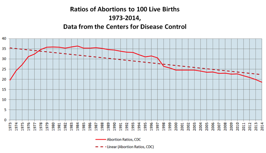 The red line in the graph below shows the decrease in abortions per 100 live births, or abortion ratios, since the early 1980s.
