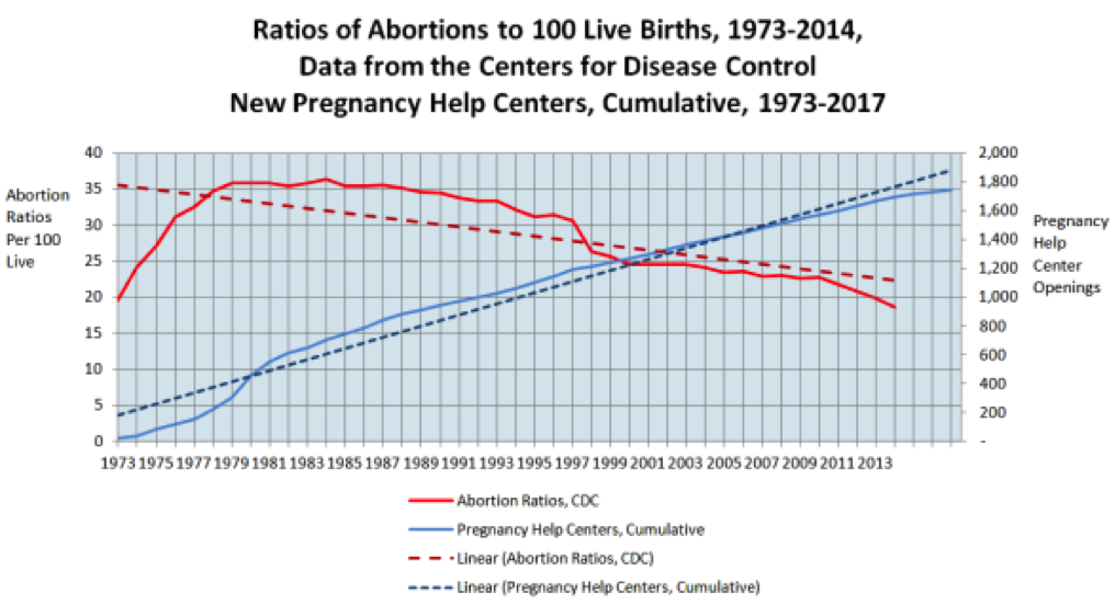 While abortion ratios have gone down (the red line below), the number of new pregnancy help centers has increased (the blue line). (Heartbeat International kindly provided the statistics on new pregnancy centers.)
